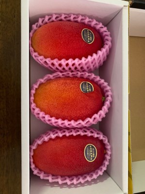 自宅用と実家の両親へのプレゼントに2つ頂きました。開封するとものすごくいい香りのするとても大きなマンゴーが入っていて驚きました。食べると果汁が溢れてジュースのようにみずみずしく甘くてあっという間になくなってしまいました。
