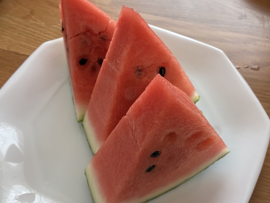 前回とても美味しかったので、今回リピートしました。年々暑さが厳しくなる中、西瓜を食べると生き返ります。シャキシャキで甘みがあるのには感激しました。我が家はふたり