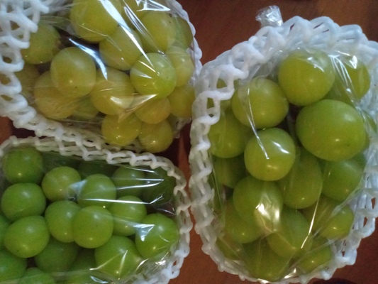 大粒のシャインマスカットが2房届きました。娘は友達と一緒にフルーツ大福やフルーツサンドを作って大満足でした。家族4人で食べても十分な量です。今年はシャインマスカットが安く手に入るようですが、近所のスーパーで売っているものとは比べ物にならないくらい美味しかったです。