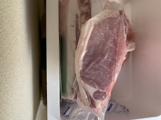どっさりとどきました!2kgのかたまりで二つ届いたので、とりあえず一つをあけて、一キロ分を厚切りにしてロースステーキとして食べました。もう1キロは塊のままオーブンで焼いてローストビーフにするつもりです。端っこは野菜と炒めて食べました。それでもあと2kgあります。どうしようかな。