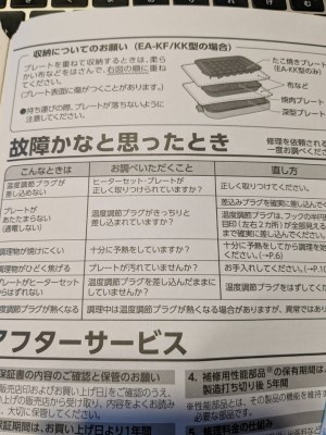 たこ焼、焼肉、お好み焼きのプレートが付いて満足しています。たこ焼も上手に焼けます。掃除もしやすく、コンセントが長いので助かっています。家族4人でちょうどいい大きさです。良い製品を寄付で頂き、ありがとうございました。