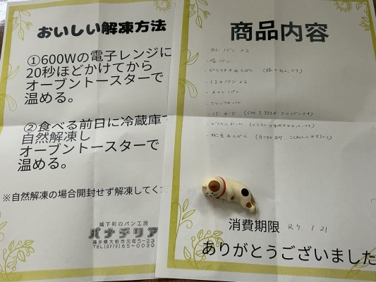 大小さまざまなパンが14個入っており、賞味期限は冷凍でおおよそ3週間前後でした。商品内容が手書きで記されており、とても親しみを感じました。