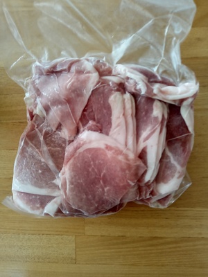 お肉はプラスチックトレーではなく、ビニール袋に500kgずつに小分けして入っているので、冷凍庫がかさばらず助かります。豚肉は脂身は少なく赤身が多くて、上質で美味しいです。そのため、満足度はかなり高いです。
